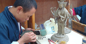 Jim zo or clay work is an ancient craft having been practiced and passed on over the centuries. This art work preceded other sculpture works such as bronze or other metal works. Statues of deities, gods and goddesses and other prominent religious figures in fact exemplify clay work in Bhutan. Every monastery, temple and the Dzongs have in them installed clay statues from where pilgrims and devout Buddhists draw their inspiration from. The master craftsmen are known as Jim zo lopen and the skill is imparted to the young novices through vigorous trainings spread over the years.