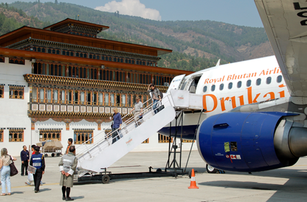 The country has so far only one airport that caters to the needs of visitors coming in through flight. However, an international airport is under construction in Gelephu that will eventually provide passengers with a choice of their entry to Bhutan. The Bhutan's only international airport at Paro, is located at a height of 7300 ft above sea level and surrounded by mountains and hills as high as 16,000 feet. Druk Air is the national air operating with two A319. It flies to destinations that include Bangkok, Delhi, Kolkata, Bodh Gaya, Dacca, Kathmandu and Guwahati in Assam and Plans are also underway to invite other private airliners.