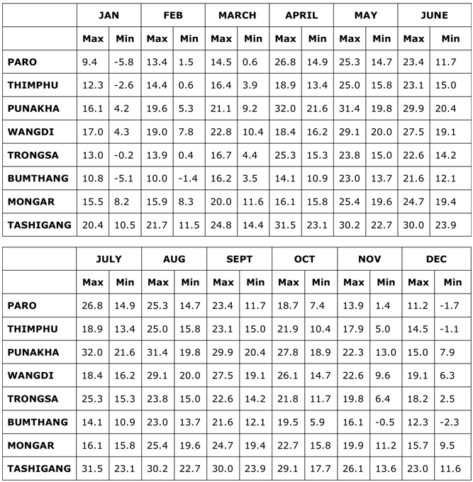 As a guide, rainfall in Thimphu and Paro is about 25mm a month in January to March, rising to 50 mm