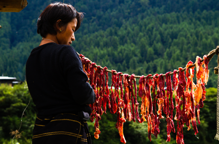 Traditional Bhutanese eating habits are simple and generally eat with their hands. The family members eat sitting cross legged on the wooden floors with food being first served to the head of the household. It is usually women who serves food and in most cases the mother. Before eating, a short prayer is offered and a small morsel placed on the wooden floor as offerings to the spirits and deities. With modernization, eating habits have changed and in urban areas, people usually eat with spoons and make use of dining tables and chairs.